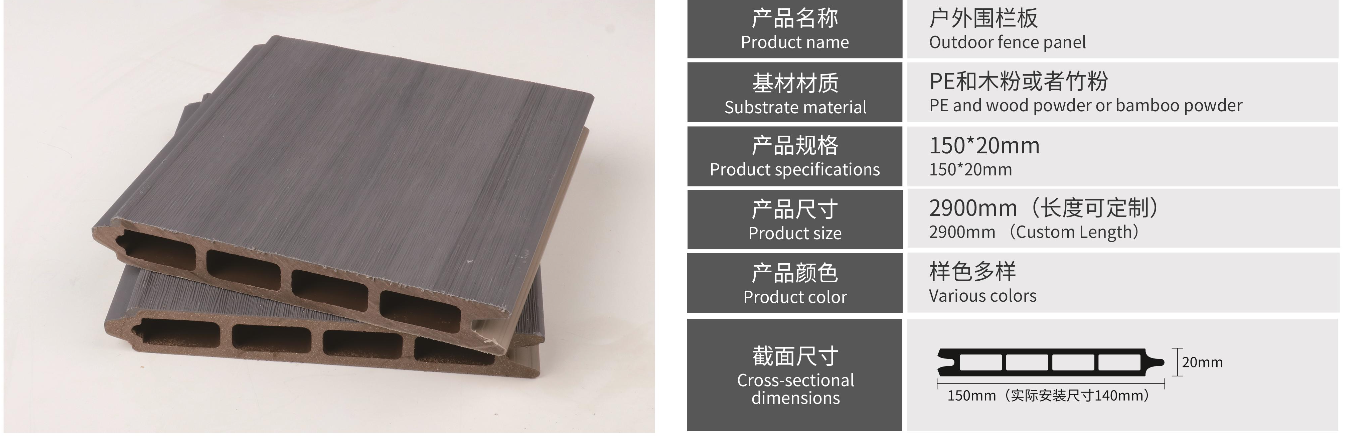 El panel de cercas para exteriores está fabricado en PE combinado con polvo de madera o bambú, ofreciendo resistencia al fuego, a la humedad y a los rayos UV. Su diseño hueco proporciona ligereza y facilidad de instalación, manteniendo una alta durabilidad y estabilidad estructural.