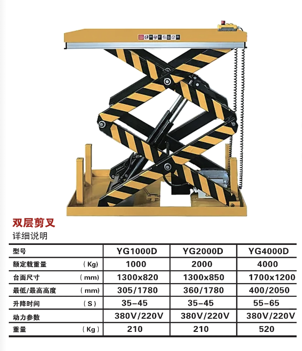 Diseñada para trabajos que requieren mayor altura, alcanzando hasta 1300 mm, con capacidad de 1000 a 4000 kg. Su sistema de tijeras dobles proporciona mayor estabilidad y es ideal para líneas de producción o manipulación de grandes volúmenes.
